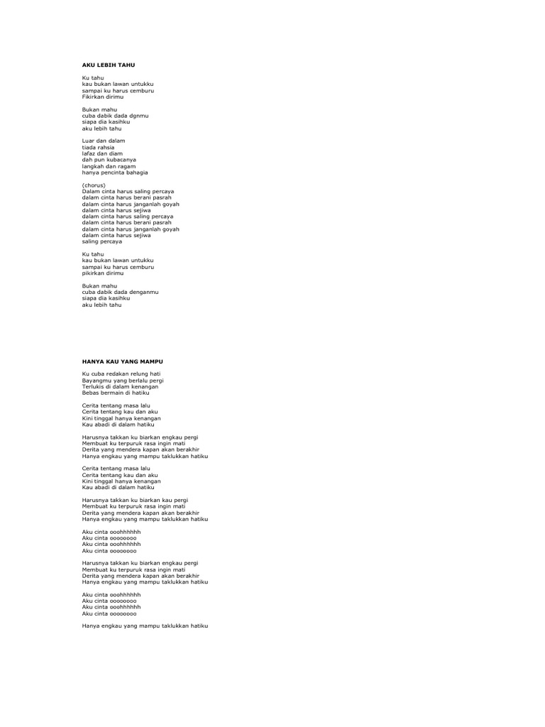 Before downloading you can preview any song by mouse over the play button and click play or click to download button to. Lyrics to 'hanya kau yang mampu' by aizat. Kamu juga bisa download secara legal di itunes untuk mendukung artis agar terus berkarya. Cerita tentang masa lalu cerita tentang kau dan aku kini tinggal hanya kenangan kau abadi di dalam hatiku. e b ku cuba redakan relung hati, d c#m bayangmu yang berlalu pergi, a b terlukis di dalam kenangan, g#m c#m bebas bermain di hatiku. Savesave hanya kau yang mampu for later. Hanya kau yang mampuku cuba redakan relung hatibayangmu yang berlalu pergiterlukis di dalam kenanganbebas bermain di hatikucerita tentang masa lalucerita. Now we recommend you to download first result hanya kau yang mampu aizat lyrics mp3. Tanpamu tiada berarti tak mampu lagi berdiri cahaya kasihmu menuntunku kembali dalam dekapan tanganmu. Harus nyatakan ku biarkan engkau pergi. Klu ade komen, jgn malu jgn sgan emel aku kt proguitarist_91@yahoo.com.my. 0 ratings0% found this document useful (0 votes). Aizat hanya kau yang mampu(duet) recorded by ladyarika_r and gsf_azie on smule.